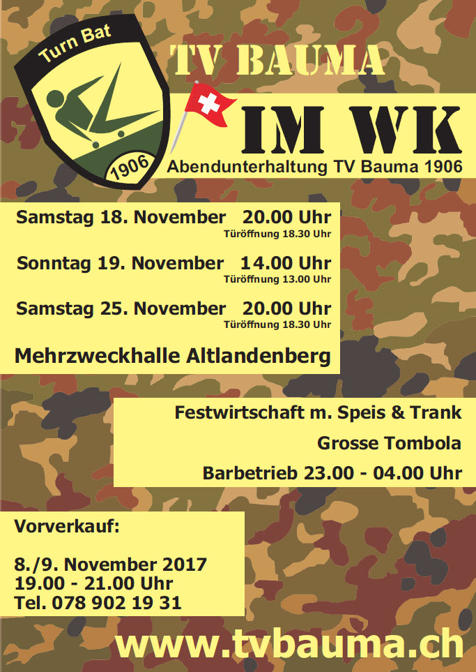 Chränzli 2017 8. November 2017 Die beiden Abendvorstellungen sind bereits ausverkauft. Wir wurden von der grossen Nachfrage überrascht. Abendunterhaltung 2017 18./19. und 25. November 2017 ⇒ Infos Sitzplatzreservation