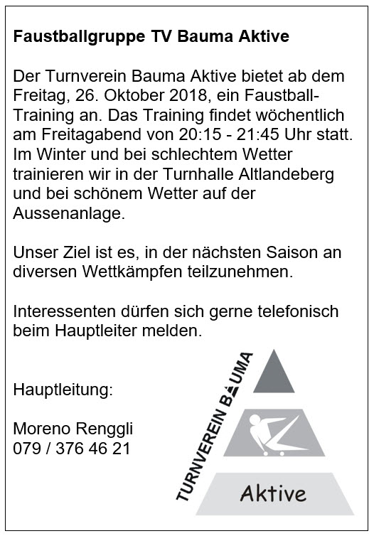 Der Turnverein Bauma Aktive bietet ab dem Freitag, 26. Oktober 2018, ein Faustball-Training an. Das Training findet wöchentlich am Freitagabend von 20:15 – 21:45 Uhr statt. Im Winter und bei schlechtem Wetter trainieren wir in der Turnhalle Altlandeberg und bei schönem Wetter auf der Aussenanlage. Unser Ziel ist es, in der nächsten Saison an diversen Wettkämpfen teilzunehmen.