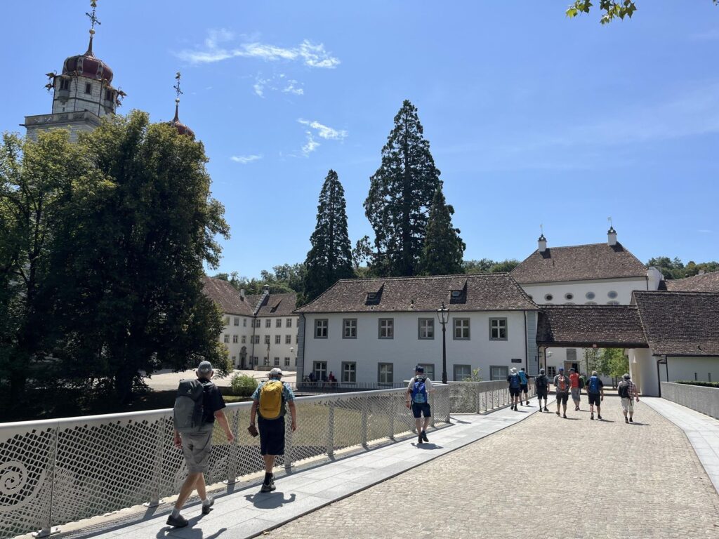Das Motto der Reise war „Rhein, Wein, glücklich sein“. Die 19 Männerriegler kamen dabei voll auf ihre Rechnung. Im Schloss Teufen gab’s zu den spannenden Informationen über das Schloss, den Landwirtschaftsbetrieb und die Weinproduktion fruchtigen Wein zu degustieren. Eglisau, unser nächster Treffpunkt, erreichten die einen zu Fuss, andere mit dem ÖV oder sogar schwimmend im Rhein. Weiter war wieder Aufmerksamkeit gefragt. Im Stromhaus Burenwiesen erfuhren wir während einer Führung allerhand über die elektrische Energie, die uns in Zukunft beschäftigen wird. Der Abend gestaltete sich ruhig, da die Wirtschaften in Eglisau ihre Tore bereits um 22 Uhr schlossen. Am nächsten Morgen spazierten wir durch Schaffhausen, bestaunten die vielen Erker und prächtigen Häuser, bevor wir dem Rhein entlang den imposanten Rheinfall erreichten. Beim Schiffsteg wartete ein Boot, das uns zunächst nahe an den bedeutendsten Wasserfall Europas heranführte, der im Moment 300 m3 /s Wasser mit mächtigem Getöse herunterdonnern liess und das Schiff arg ins Wanken brachte. Bei angeregtem Gespräch fuhren wir weiter zur Halbinsel Rheinau. Die mächtigen Türme und der Innenraum des einstigen Klosters mit der reichen, barocken Ausstattung faszinierten uns. Nach einem leckeren Mittagessen folgte als letzte sportliche Betätigung der Marsch zurück zum Rheinfall. Einige brauchten bei dem prächtigen Wetter ein Bad im Rhein, bevor uns der ÖV nach Bauma brachte. Vielen Dank, Chrigel, für die abwechslungsreiche Tour!