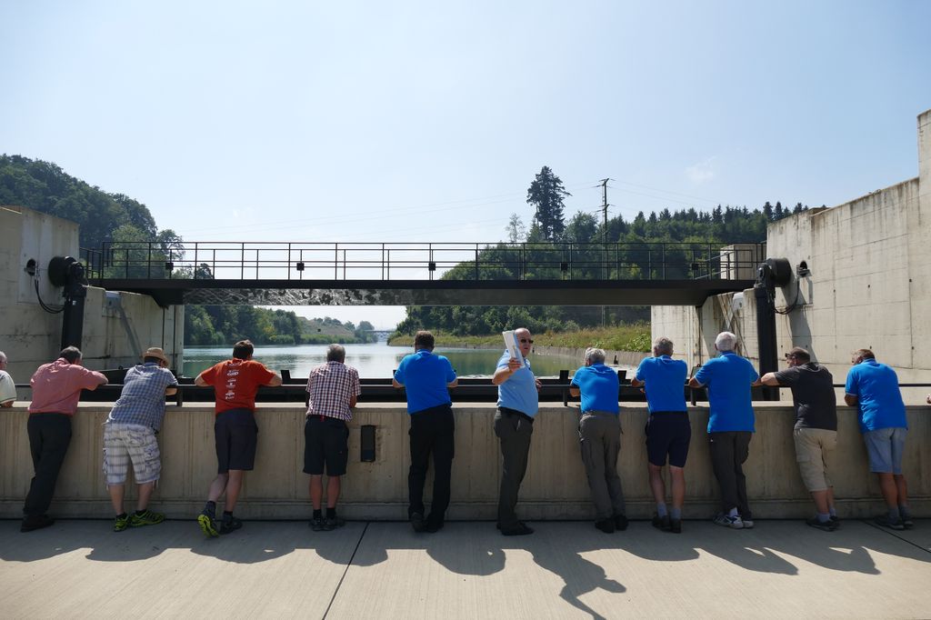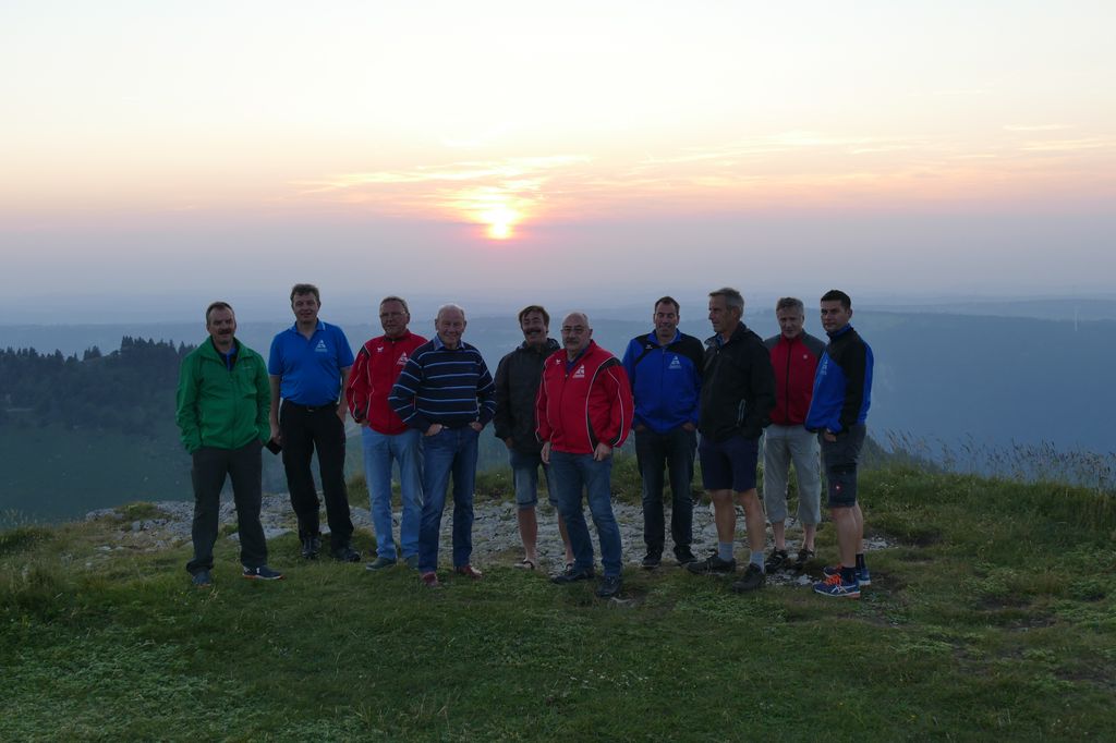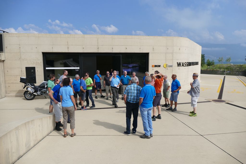 7./8. Juli 2018 – 26 Turner vertrauten sich der kundigen Leitung von Erhard Marcolin an, der uns in den Berner Jura entführte. Als Erstes besichtigten wir das 2015 neu erbaute Hagneckkraftwerk und staunten über die gewaltige Anlage, die sich gedrungen in die Landschaft einfügt. Der Natur wurde mit einer imposanten, durchdachten Fischtreppe Rechnung getragen, so dass die Fische die Staustufe problemlos überwinden können. Zu Fuss, per Bus und Schiff erreichten wir die historischen Städtchen Lüscherz, Erlach und La Neuveville. Ein paar Wagemutige nützten die Wartezeit für ein erfrischendes Bad im Bielersee. Das Postauto brachte uns schliesslich auf den Chasseral, wo wir beobachten konnten, wie die Sonne glutrot hinter dem Horizont versank.